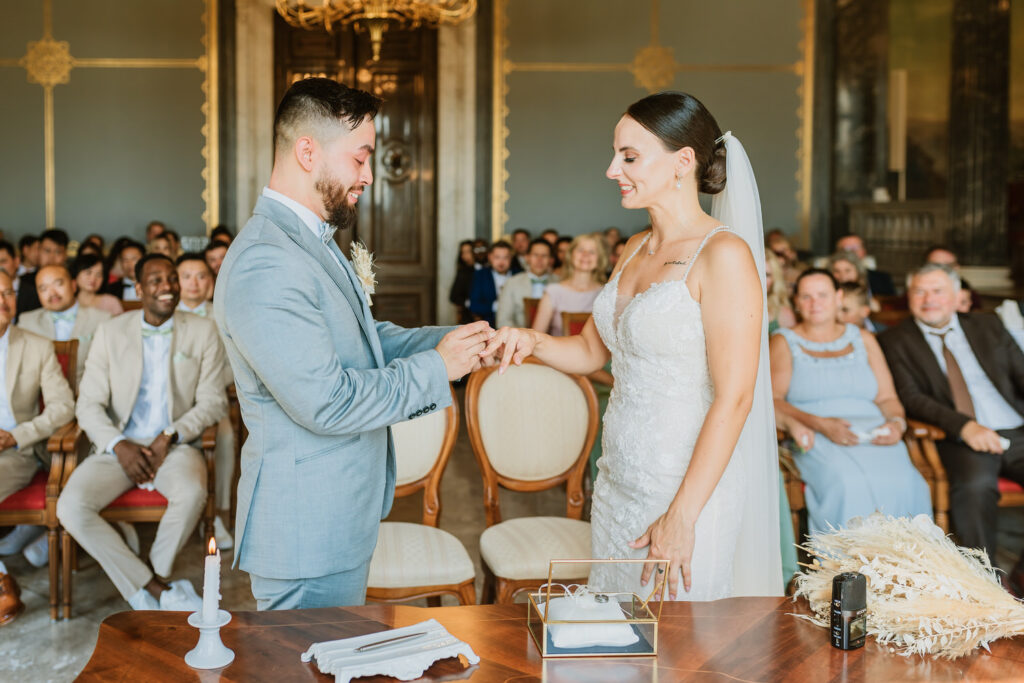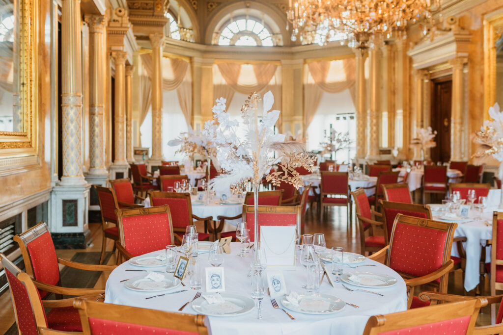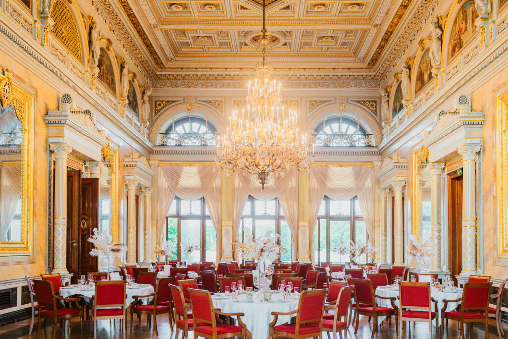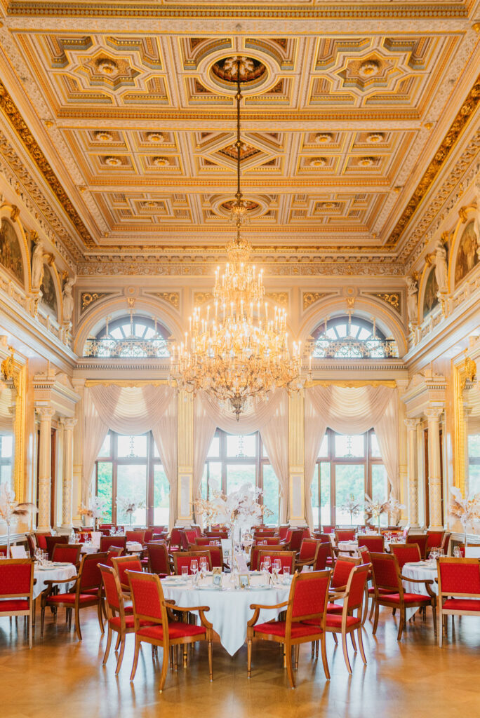 Allein die Anfahrt durch den Schlosspark mit seinen uralten Bäumen lässt jedes Herz höher schlagen. Sobald man das Schloss betritt, fühlt man sich wie in eine andere Zeit versetzt – die prächtige Architektur und das stilvolle Interieur schaffen eine wahrhaft märchenhafte Atmosphäre. Für Brautpaare, die von einer romantischen Traumhochzeit träumen, ist das Schloss einfach die perfekte Kulisse.