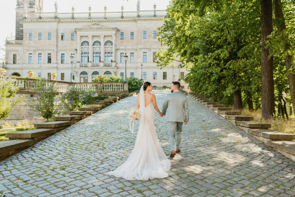 Als Hochzeitsfotografin ist mir die Umgebung für die Hochzeitsfotos besonders wichtig. Schloss Albrechtsberg bietet unglaublich viele schöne Ecken, die sich für unvergessliche Bilder eignen. Ob die imposante Treppe, die Terrasse mit Blick auf die Elbe oder der Garten im Sommer – hier gibt es unzählige Möglichkeiten, die Magie eures großen Tages festzuhalten.