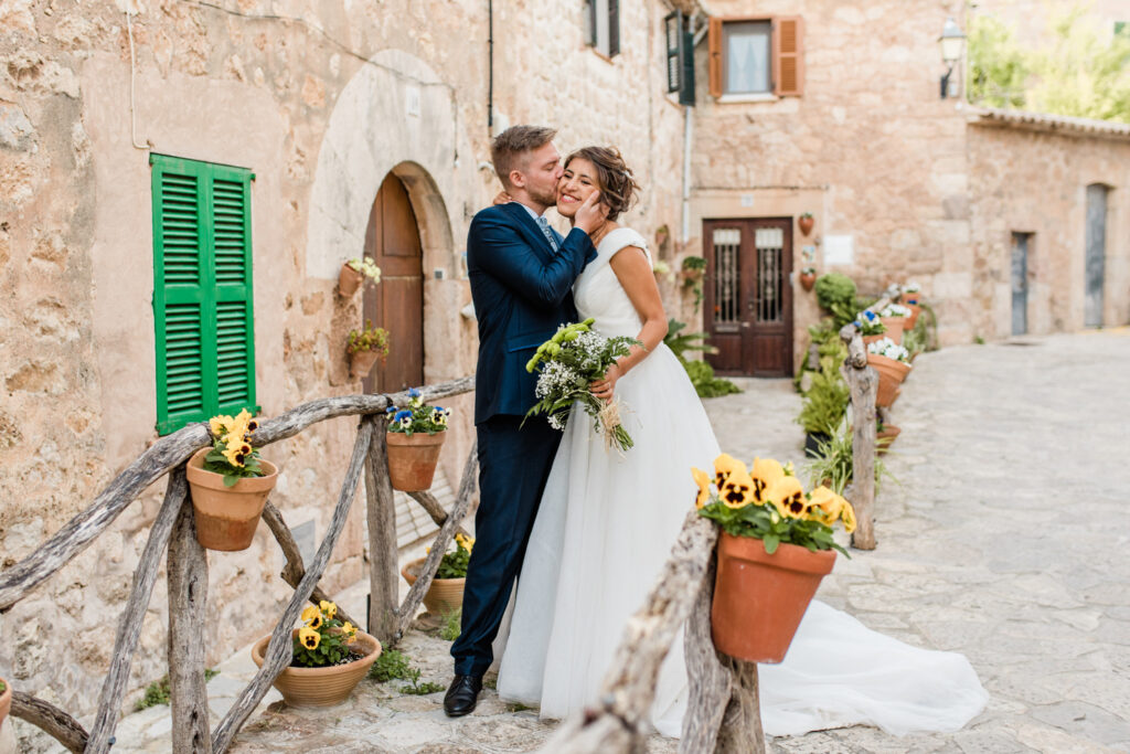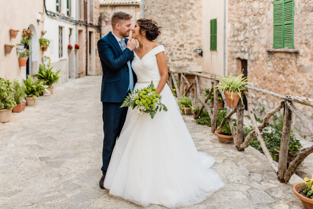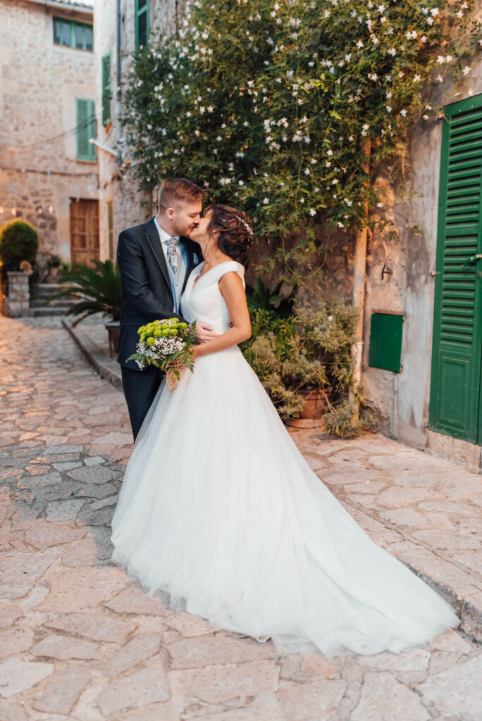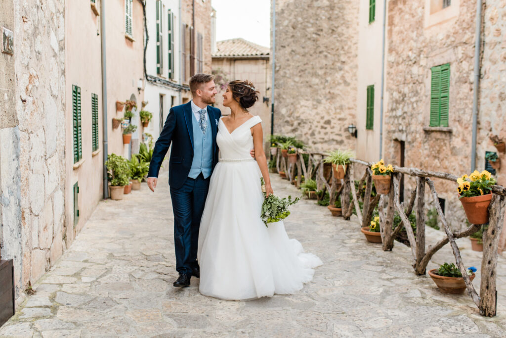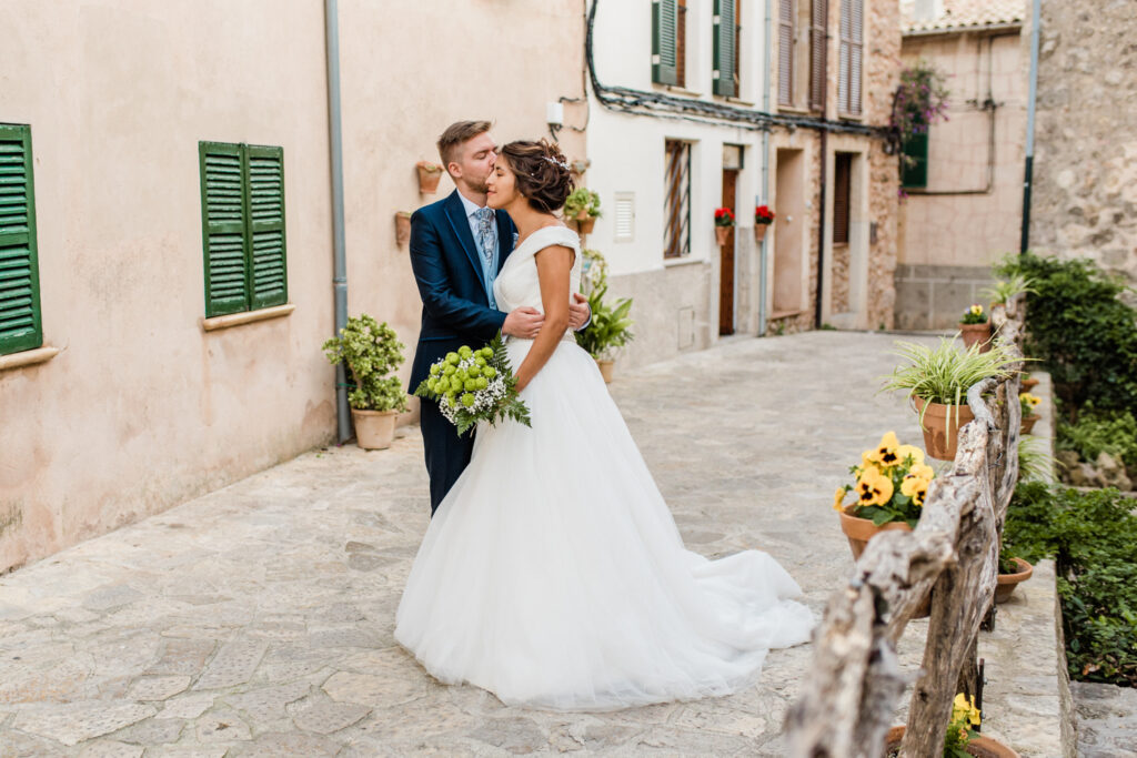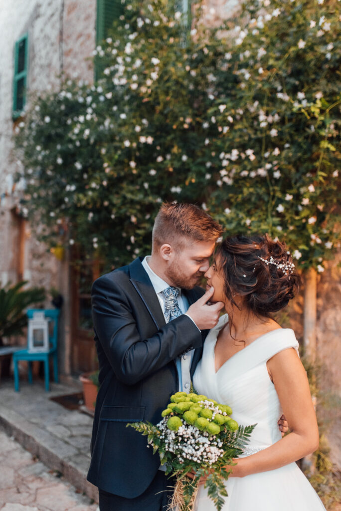 Nach zwei Tagen haben wir uns  auf ein Brautpaarshooting getroffen. Als Location haben wir die blumigen Straßen von Valldemossa ausgewählt.