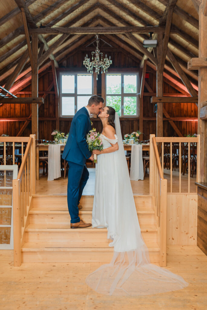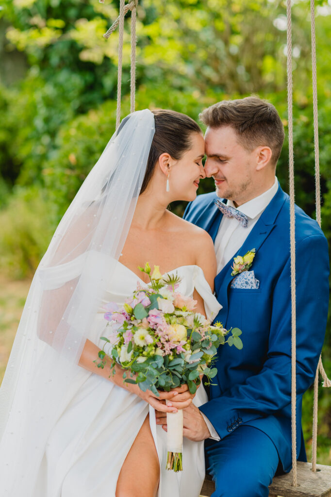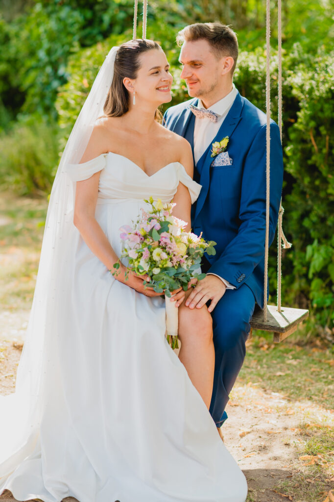Am Nachmittag hatten wir dann die Zeit für ein Brautpaarshooting, das in der warmen Nachmittagssonne stattfand. Die Sonnenstrahlen schufen eine ganz besondere Atmosphäre, die den Fotos das gewisse Etwas verlieh. Eines meiner persönlichen Highlights war die rustikale Schaukel auf dem Gelände – der perfekte Ort für ein paar entspannte Aufnahmen.